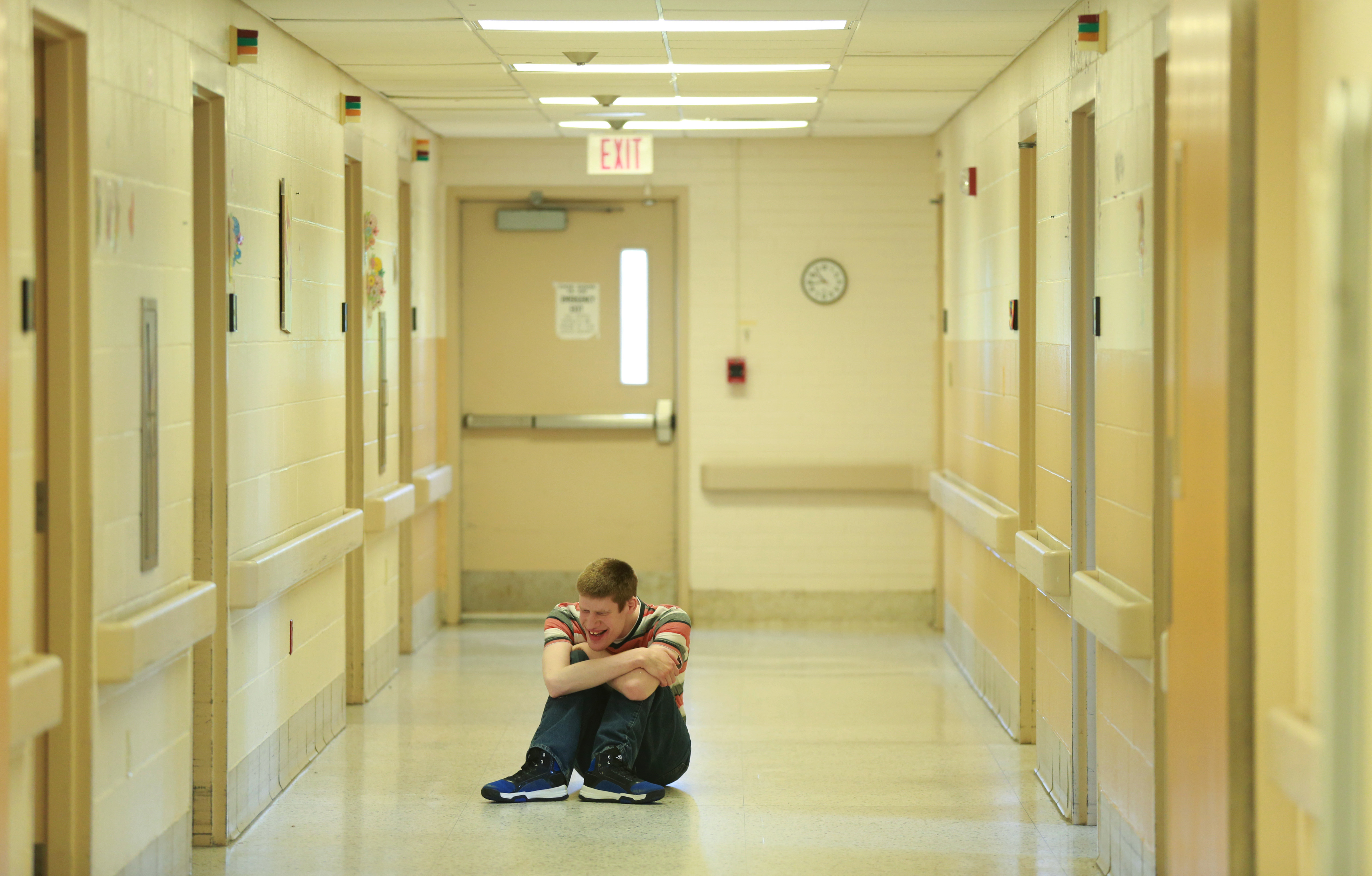 Mark Winkeler, 32, sits in a hallway in Elm Cottage at Murray Developmental Center Friday, May 20, 2016, in Centralia, Ill. Mark was born with profound developmental disabilities and has lived at the center for most of his life. Under threat by the State of Illinois to shut down the center, his parents worked to help keep the facility open for the 200+ individuals who live there. (John J. Kim/Chicago Tribune)