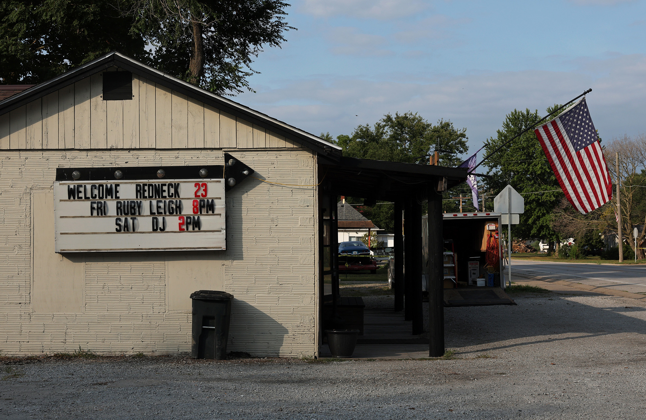 A tavern sign welcomes participants of the Redneck Fishing Tournament Friday, Aug. 4, 2023, in Bath, Ill. (John J. Kim/Chicago Tribune)