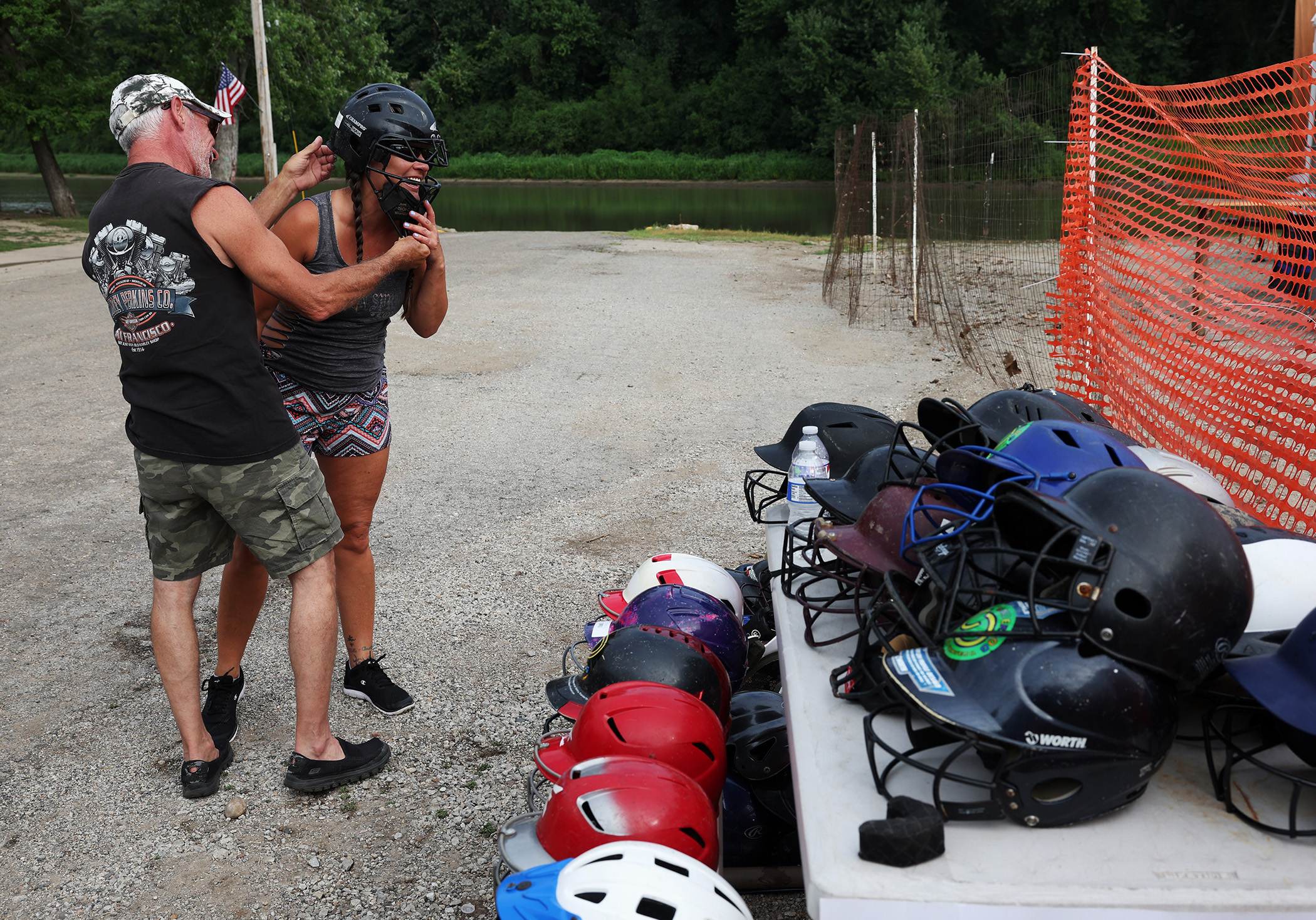 Scott Faichney and Dana Brown try on helmets for use during the Redneck Fishing Tournament Friday, Aug. 4, 2023, in Bath, Ill. (John J. Kim/Chicago Tribune)