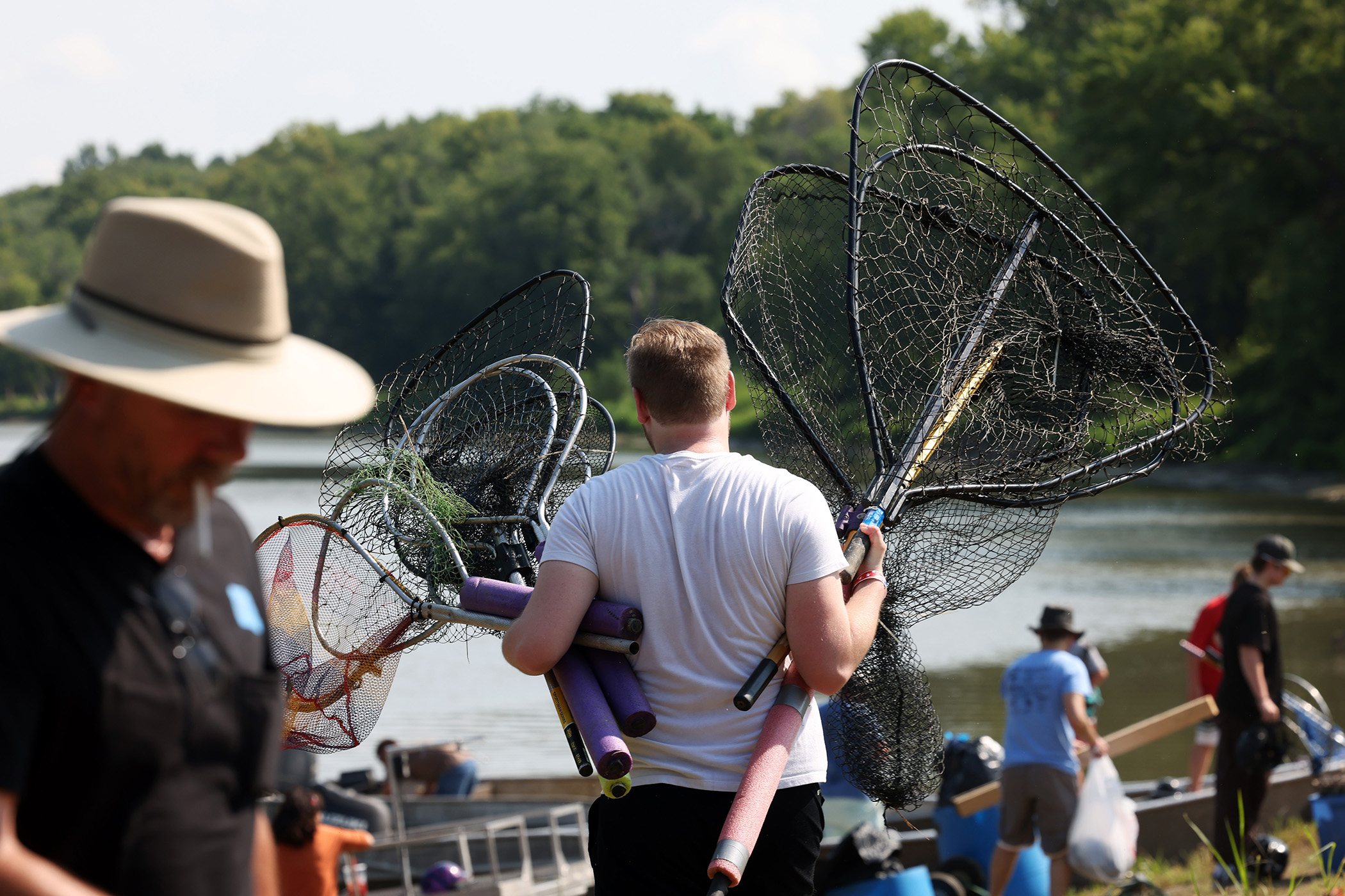 Sam Patterson carries scoop nets to his team’s boat during the Redneck Fishing Tournament Friday, Aug. 4, 2023, in Bath, Ill. (John J. Kim/Chicago Tribune)