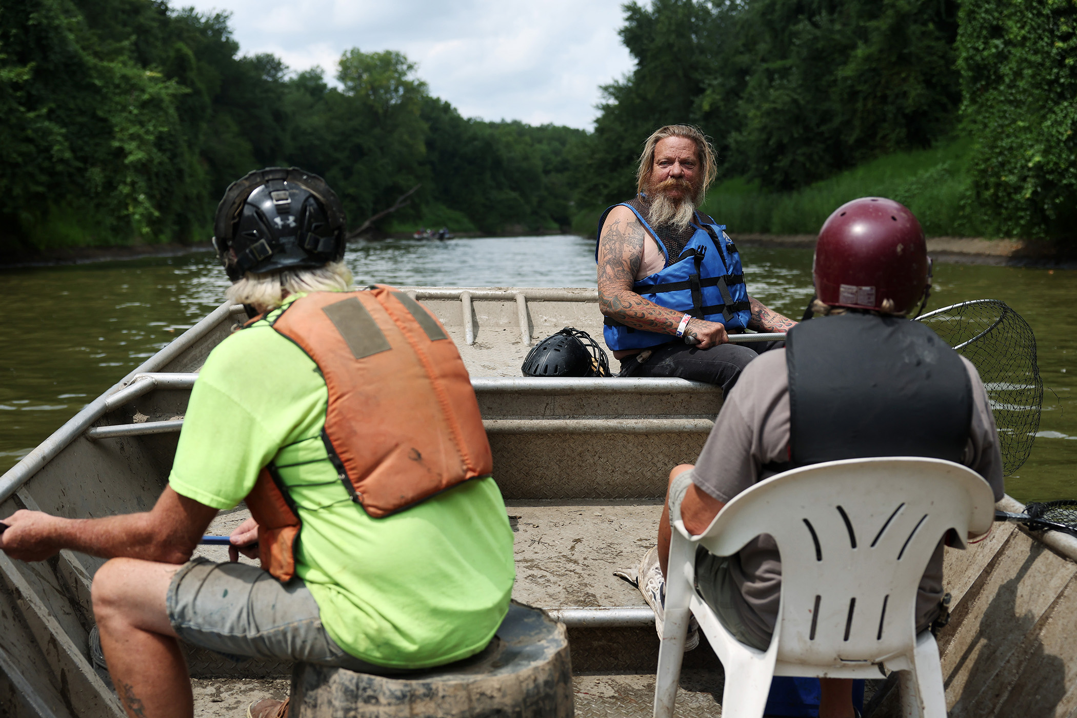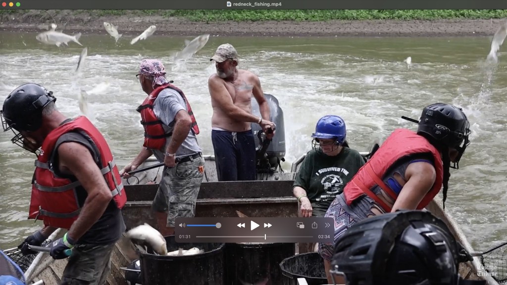 A participant who identifies himself as “Long Hair” catches a carp with a scoop net on the Illinois River during the Redneck Fishing Tournament Friday, Aug. 4, 2023, near Bath, Ill. The annual tournament to catch invasive carp was founded by Betty DeFord in 2005. DeFord’s goal was to encourage netting and removing the fish and raise funds to help veterans. (John J. Kim/Chicago Tribune)