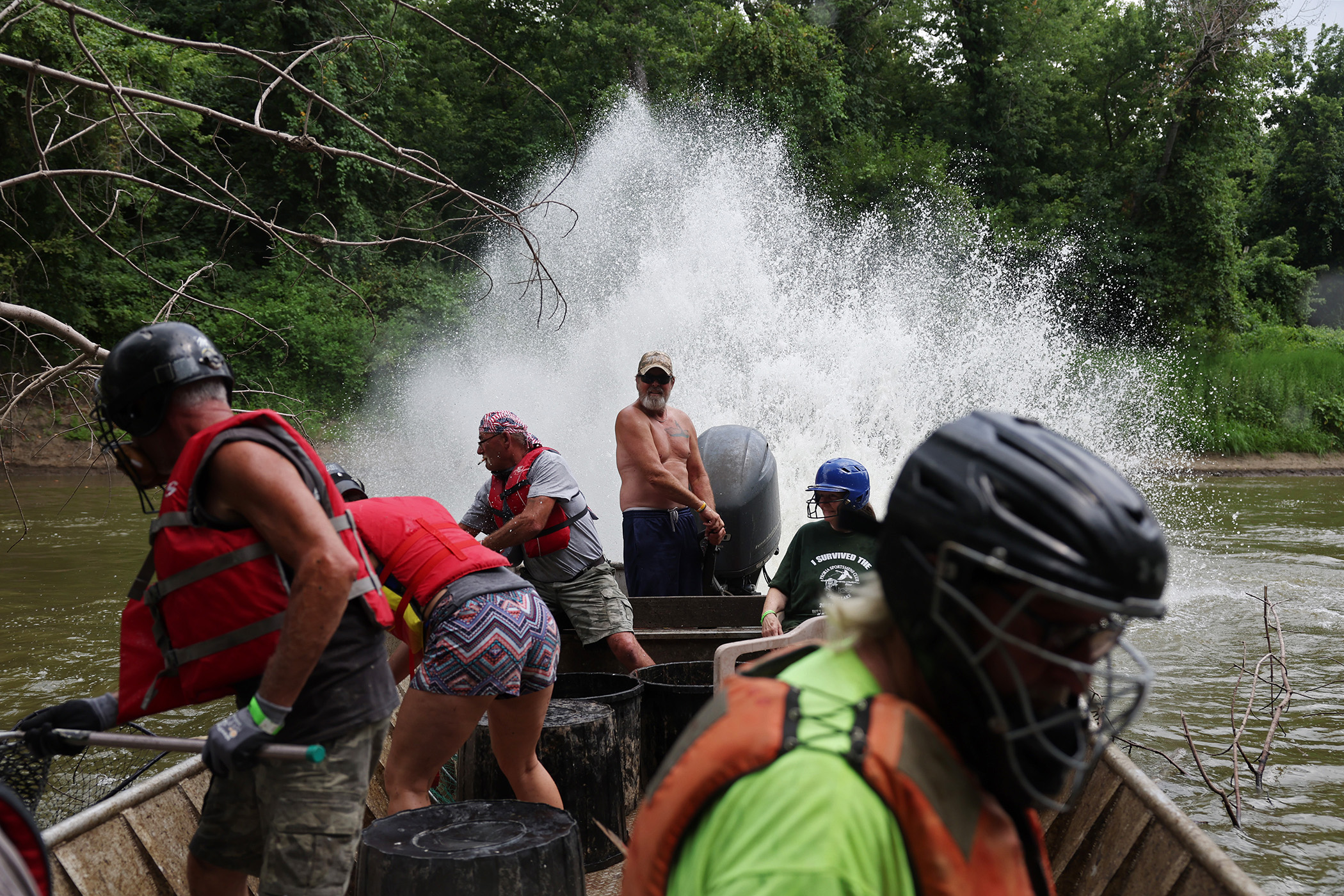 Lance Gregerson revs the boat motor to excite carp on the Illinois River for participants to catch with scoop nets during the Redneck Fishing Tournament Friday, Aug. 4, 2023, near Bath, Ill. (John J. Kim/Chicago Tribune)