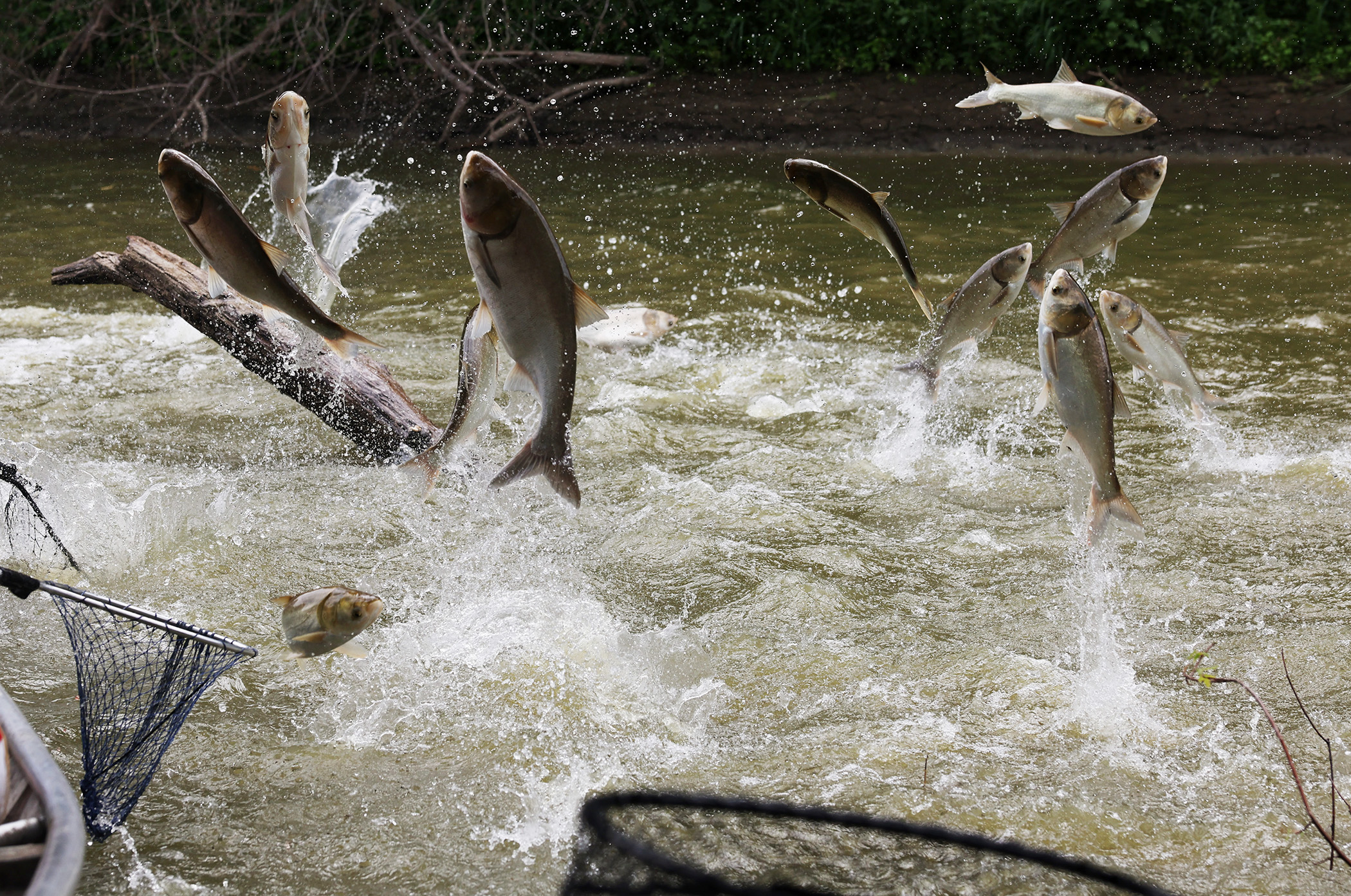 Carp leap out of the water on the Illinois River during the Redneck Fishing Tournament Friday, Aug. 4, 2023, near Bath, Ill. (John J. Kim/Chicago Tribune)