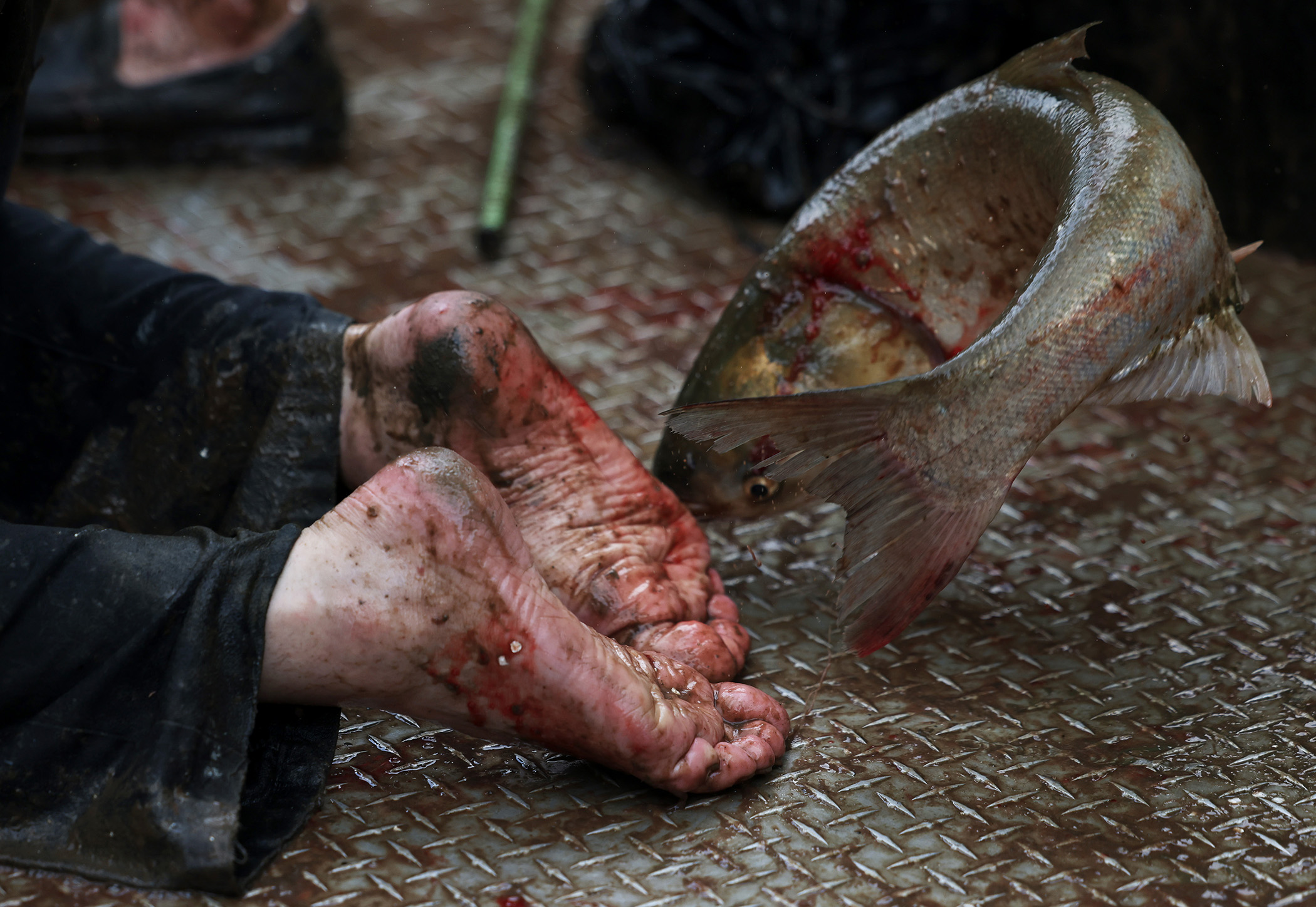 A carp flops near the feet of a participant who identifies himself as “Long Hair” on the Illinois River during the Redneck Fishing Tournament Friday, Aug. 4, 2023, near Bath, Ill. (John J. Kim/Chicago Tribune)