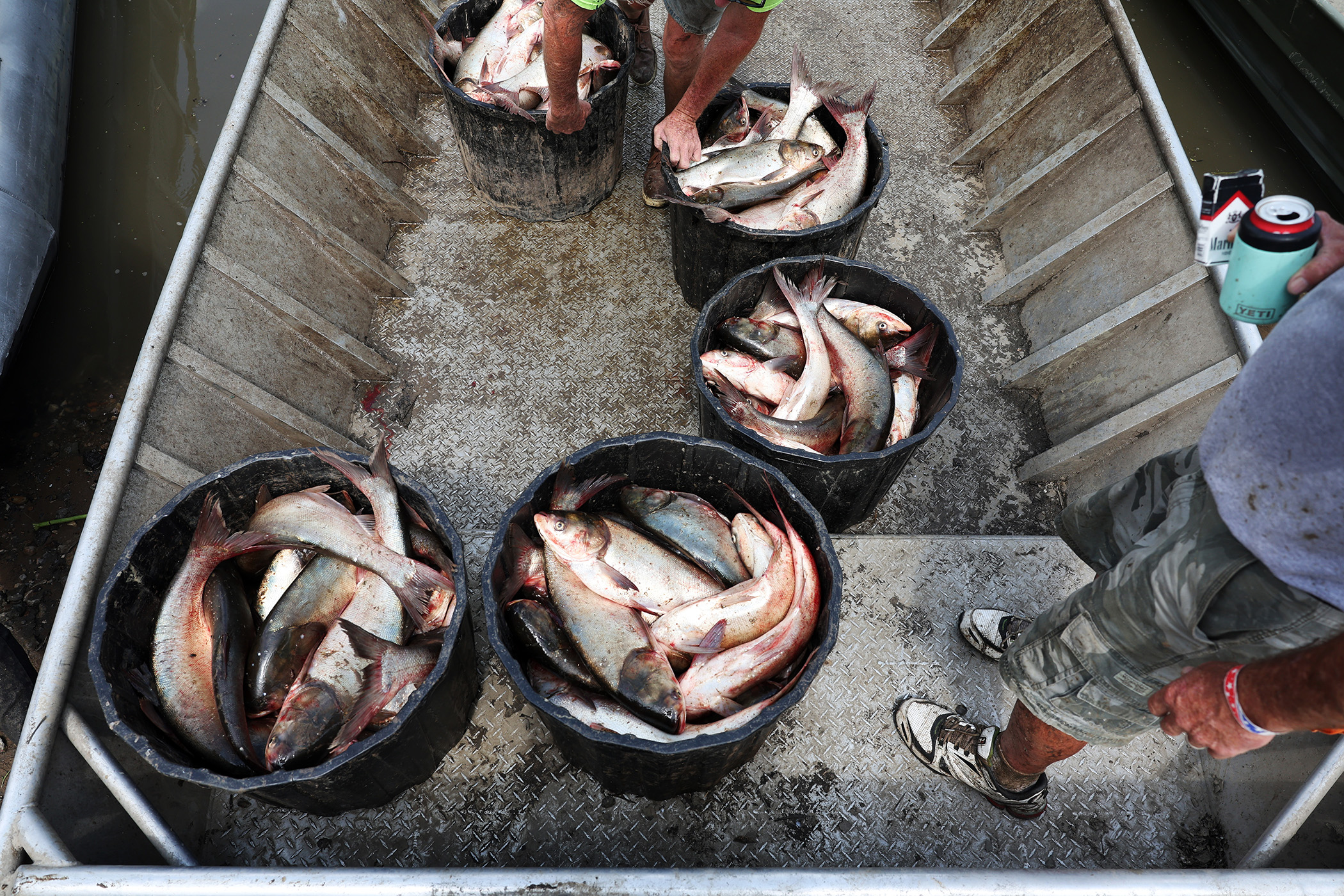 Buckets of carp caught on the Illinois River are brought to land during the Redneck Fishing Tournament Friday, Aug. 4, 2023, in Bath, Ill. (John J. Kim/Chicago Tribune)