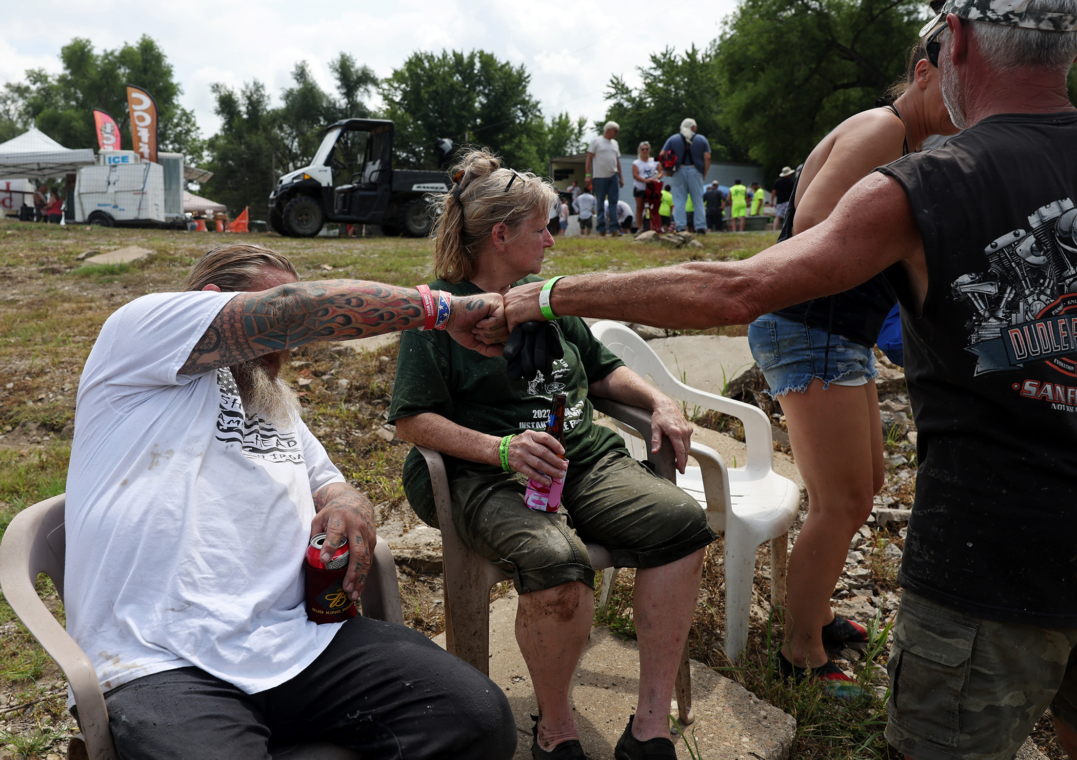 A participant who identifies himself as “Long Hair,” left, and Scott Faichney fist bump after finishing their heat in the Redneck Fishing Tournament Friday, Aug. 4, 2023, in Bath, Ill. (John J. Kim/Chicago Tribune)
