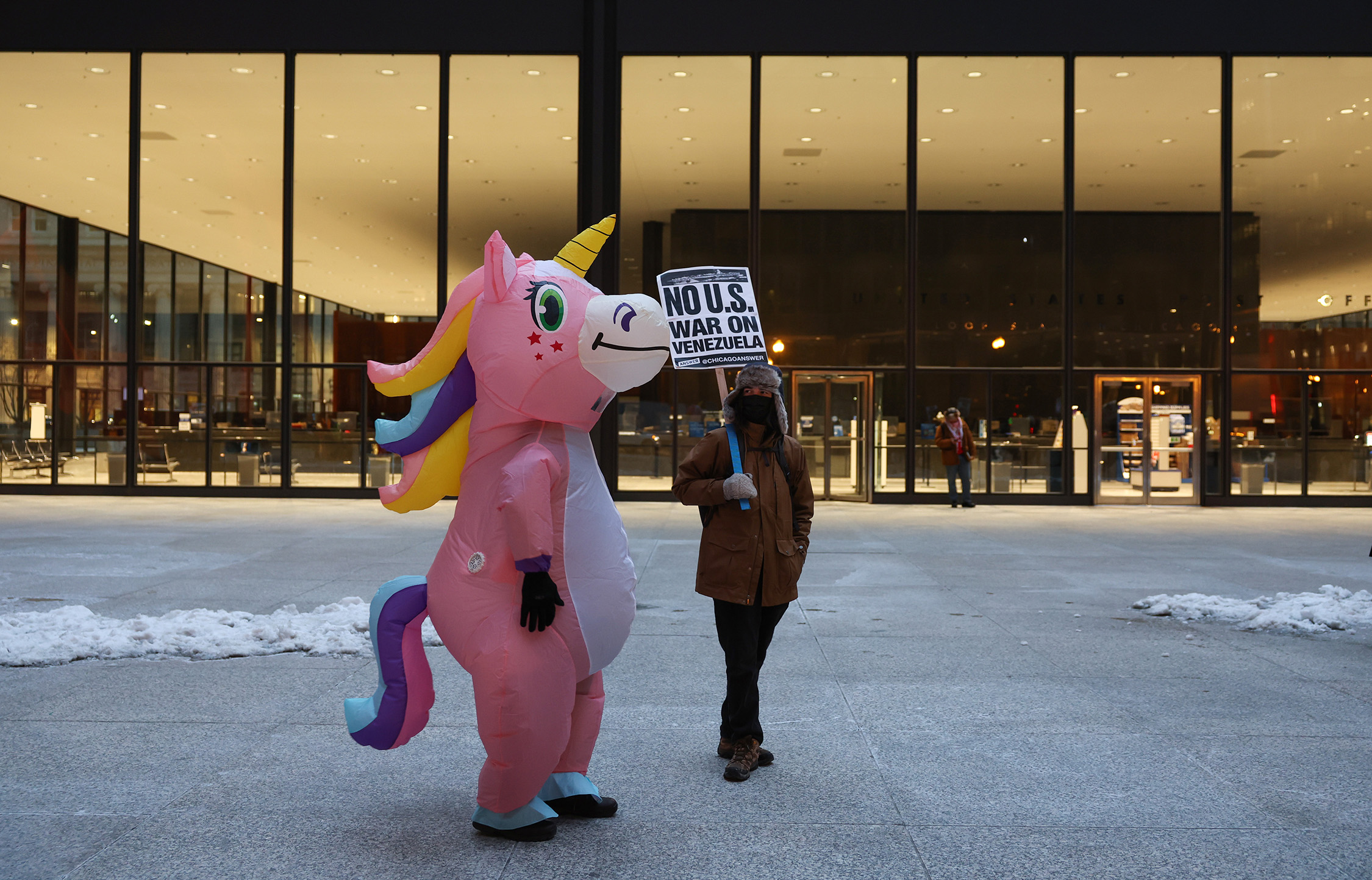 A demonstrator holding an anti-war sign talks with a person wearing an inflatable unicorn costume before a protest against the U.S. military strike in Venezuela at Federal Plaza Saturday, Jan. 3, 2026, in Chicago. (John J. Kim/Chicago Tribune)