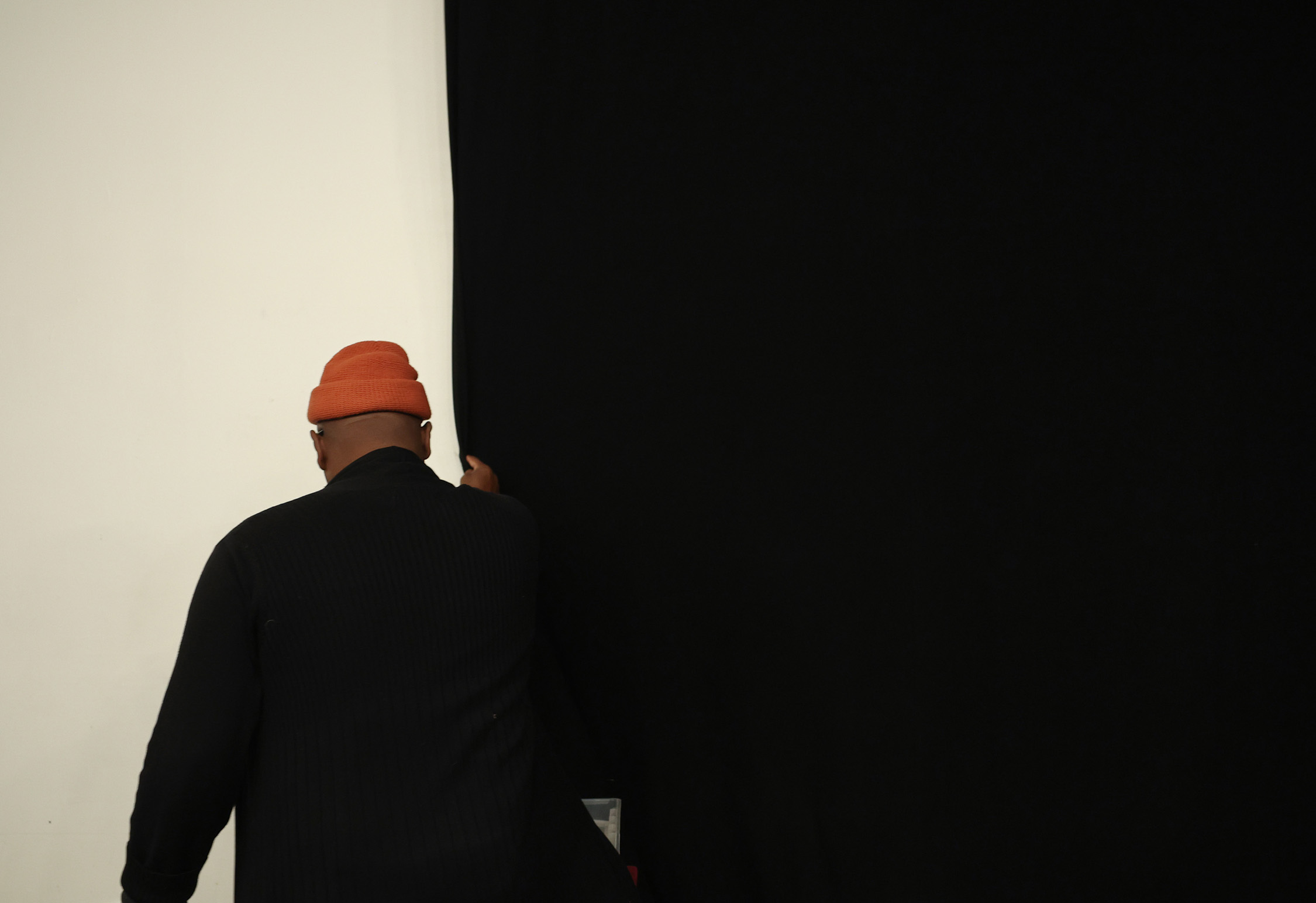 Samuel Lewis draws black curtains in preparation for a Rough House Puppet Arts Puppets-in-Progress (PiPs) workshop at Elastic Arts, 3429 W. Diversey Ave., Saturday, Feb. 28, 2026, in Chicago. (John J. Kim/Chicago Tribune)
