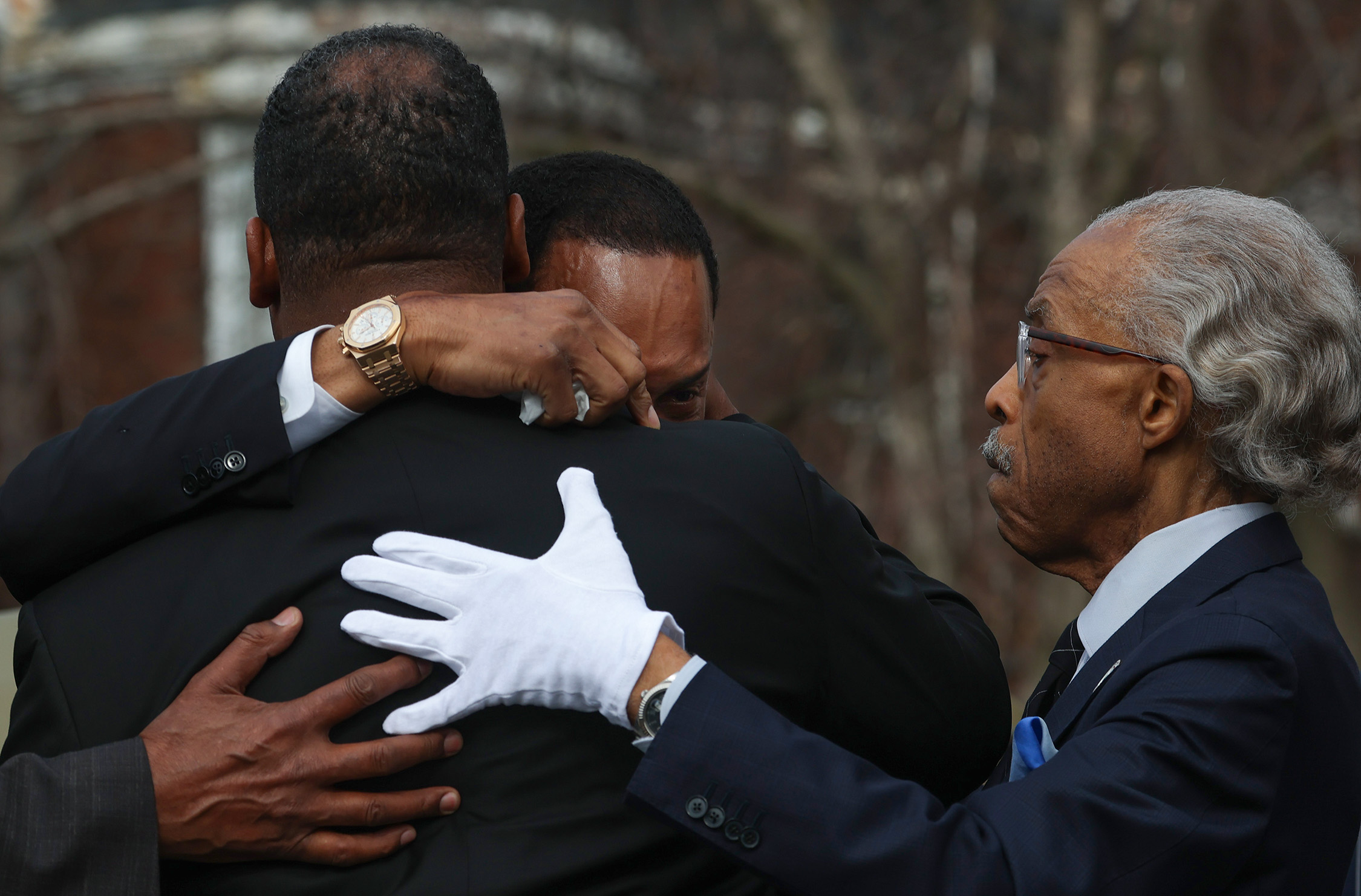 Yusef Jackson, center, hugs his brother, U.S. Rep. Jonathan Jackson, as the Rev. Al Sharpton, right, comforts both men after transporting the casket of their father, the Rev. Jesse Jackson, into a hearse following his funeral service at Rainbow PUSH Coalition Saturday, March 7, 2026, in Chicago. (John J. Kim/Chicago Tribune)